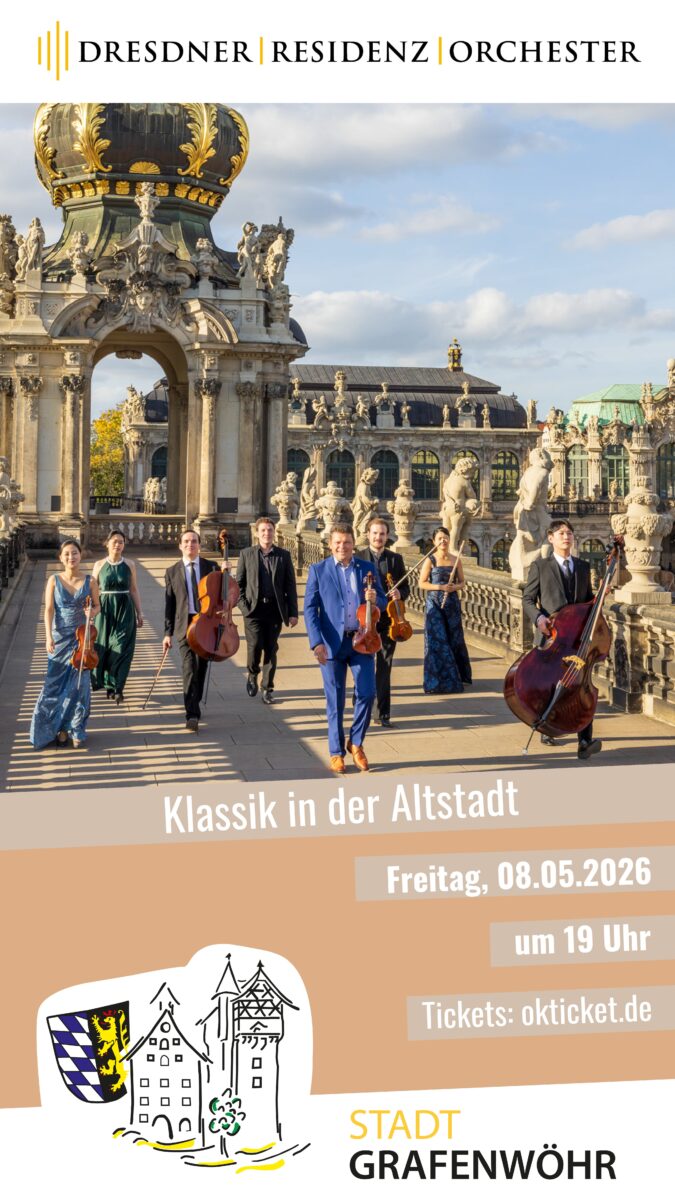 Das Altstadtfest Grafenwöhr beginnt am 08. Mai um 19 Uhr mit einem Konzert des Dresdner Residenz Orchesters unter dem Titel „Klassik in der Altstadt“. Vor dem festlich beleuchteten Rathaus gibt es am Marienplatz Höhepunkte der klassischen Musik. Tickets sind erhältlich unter www.okticket.de sowie in Grafenwöhr bei der Reisewelt und der Sparkasse.
