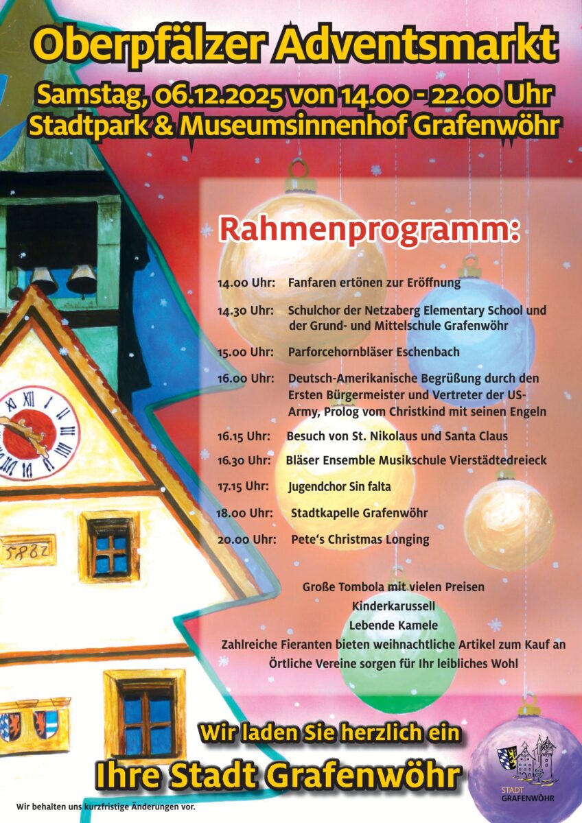 Budenzauber, allerlei Leckereien aus der Region und aller Welt, weihnachtliche Waren und ein umfang- und abwechslunsgreiches Musikprogramm warten auch dieses Jahr wieder beim Oberpfälzer Adventsmarkt in Grafenwöhr – am Nikolaustag, 06. Dezember, von 14 – 22 Uhr im Stadtpark und Museumsinnenhof.